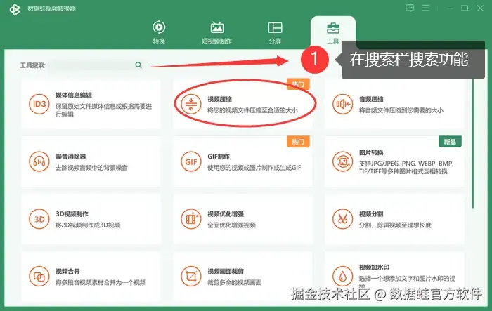 步骤一: 打开该视频转换器,首先选择 【工具】 大类,选择 【视频压缩】 功能。工具箱内有许多实用功能,用户可以根据自己的需求选择功能的使用。