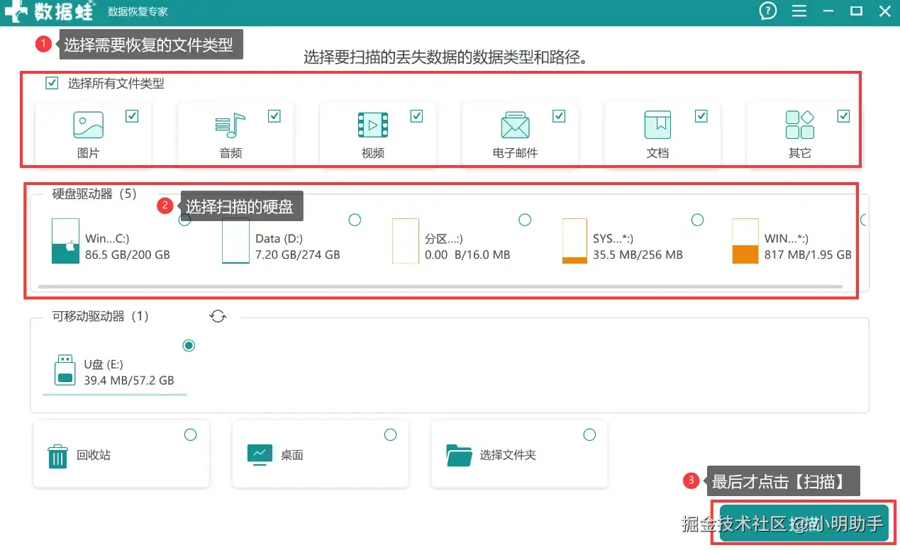 步骤1: 启动软件进入选择页面,在上方选择需要恢复的文件类型,而中下方位置选择需要扫描的位置,最后才点击【扫描】。
