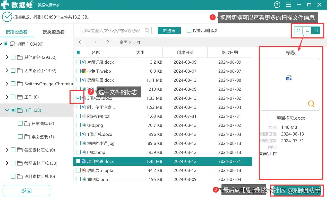 - 文件预览: 提供扫描文件的详细信息,方便选择目标文件;