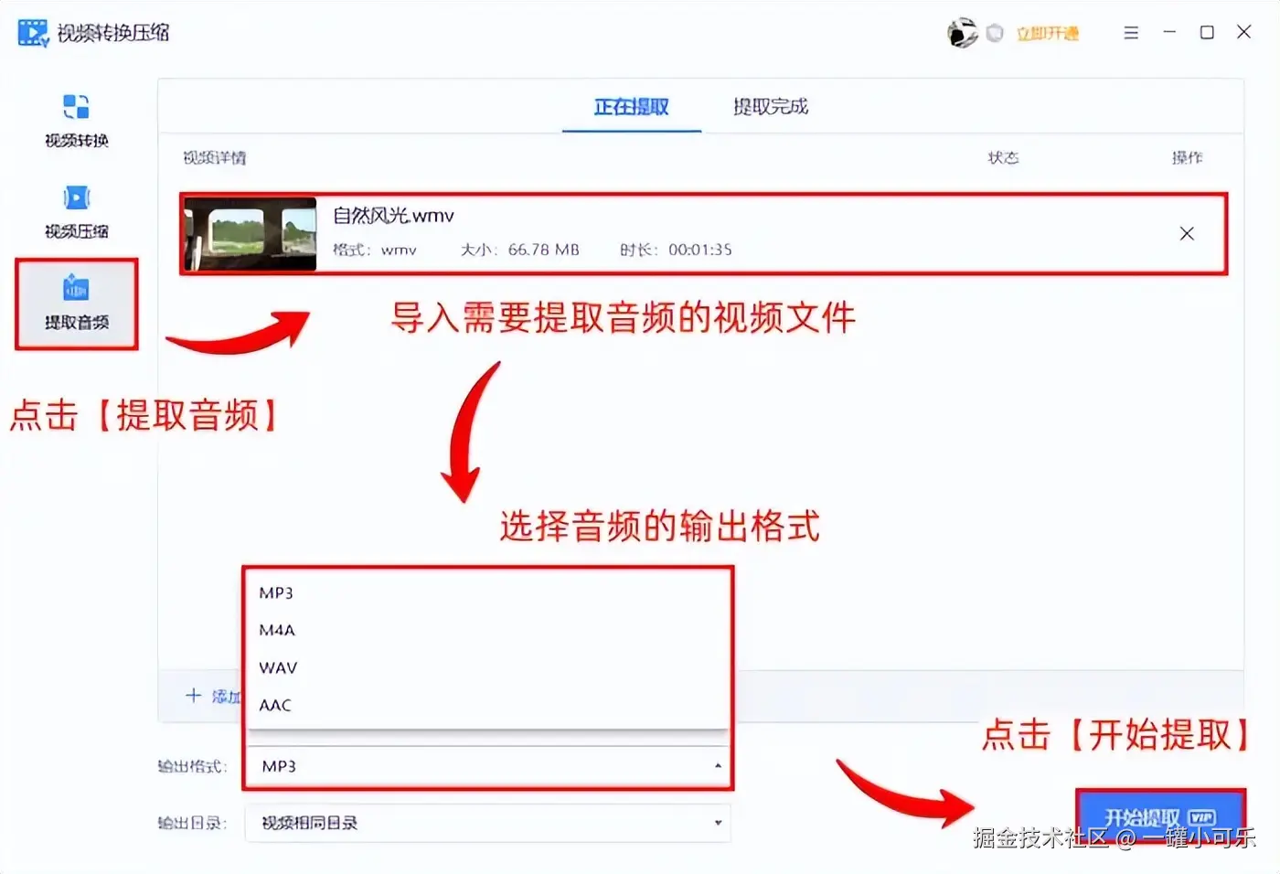 步骤2:点击 【添加文件】 导入需要提取音频的视频文件,选择音频的输出格式,然后点击【开始提取】即可。