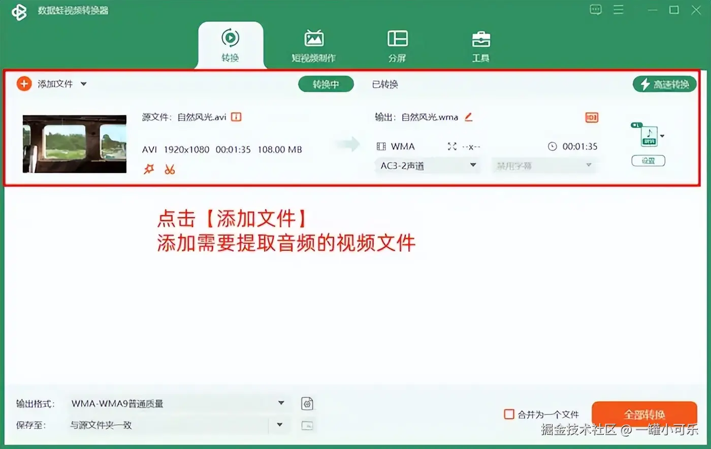步骤1:打开这个音视频处理应用,在转换工具下点击 【添加文件】 ,添加需要提取音频的视频文件。