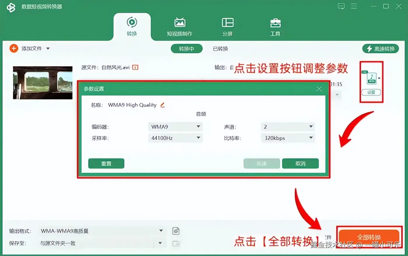 步骤3:如果你需要自定义音频参数的话,可以点击设置按钮调整参数。 完整设置后,点击【全部转换】,等待视频提取音频完成即可。