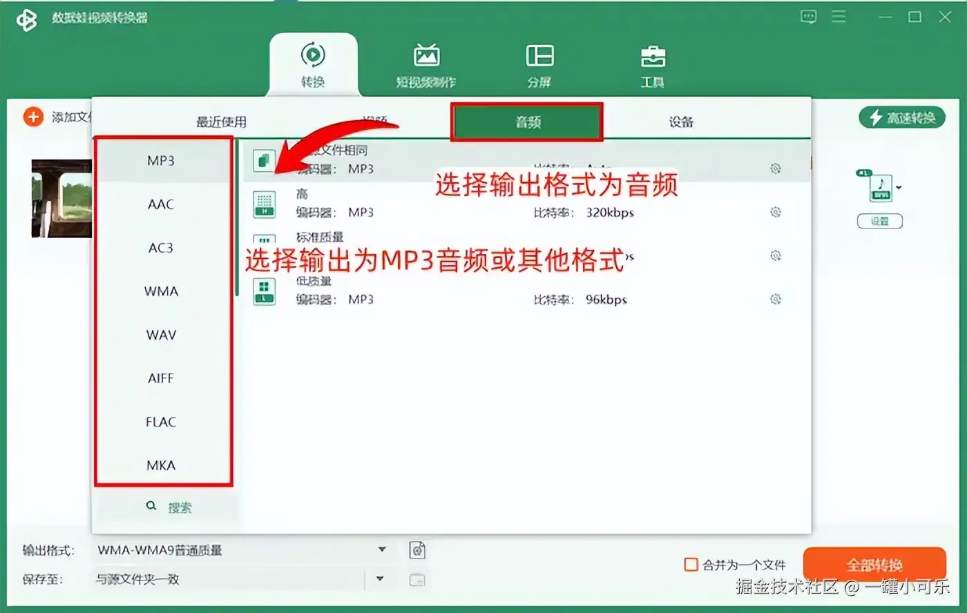 步骤2:导入视频文件后,打开 【输出格式】 列表,选择输出格式为音频,如将其输出为MP3音频。