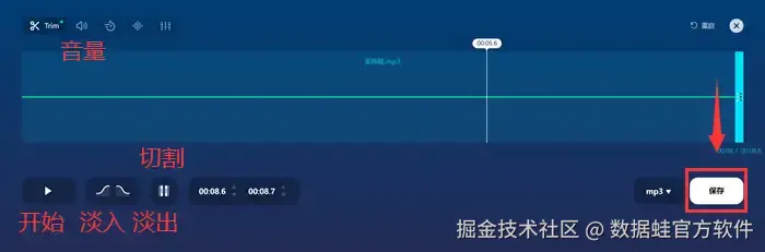 第三步: 通过拖动时间轴两端来选取要移除的片段,然后在界面下方点击 【修剪/剪切】 按钮。最后按下 【保存】 按钮,完成音频剪辑。