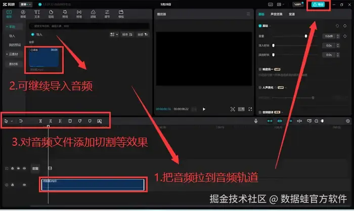 第一步: 进入剪映,导入mp3音频文件。把音频文件拖动到音频轨道中。