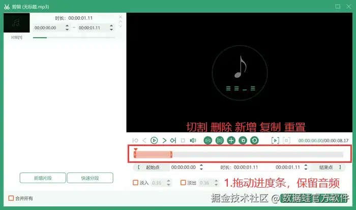 第二步: MP3怎么剪辑?点击任务栏中,原文件下的 【剪辑】 按钮,进入音频剪辑页面。拖动橙色进度条,在想减除的地方点击选择 【分割】 。根据你的个人喜好勾选 【淡入】 或 【淡出】 等选项。
