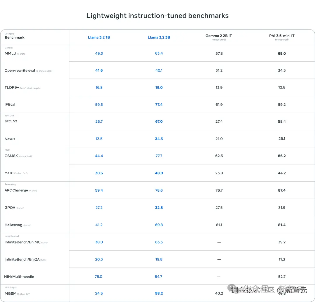 3B 模型在遵循指令、总结、提示词重写和工具使用等任务上,表现优于 Gemma 2 2B 和 Phi 3.5 mini;而 1B 模型则与 Gemma 旗鼓相当。