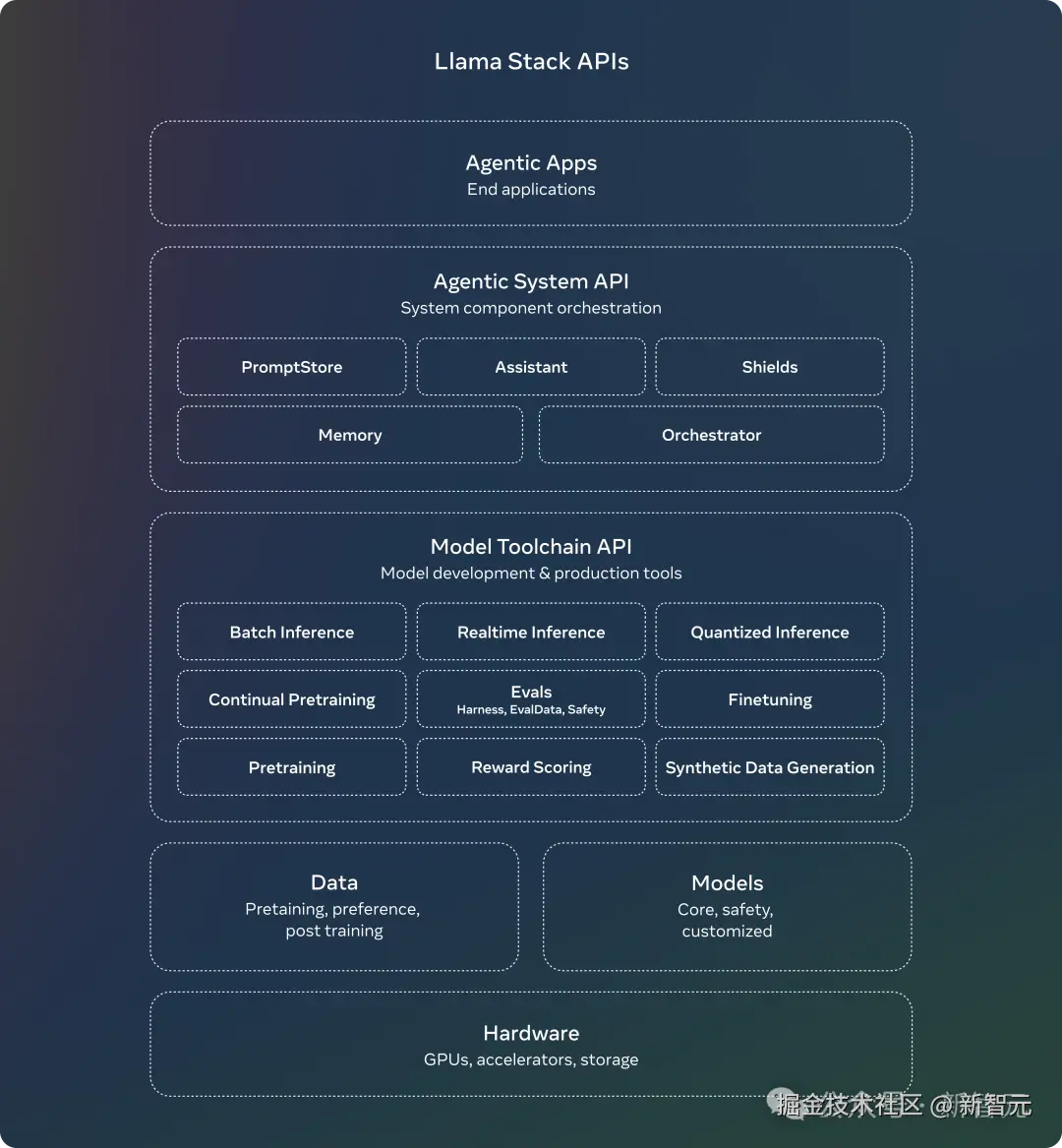 Llama Stack API 是一个标准化接口,用于规范工具链组件(如微调、合成数据生成等)以定制 Llama 大语言模型并构建 AI 智能体应用。