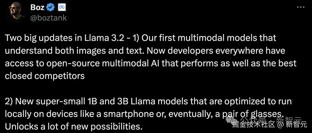 Meta 首席技术官对 Llama 3.2 的发布,做了两大亮点总结: