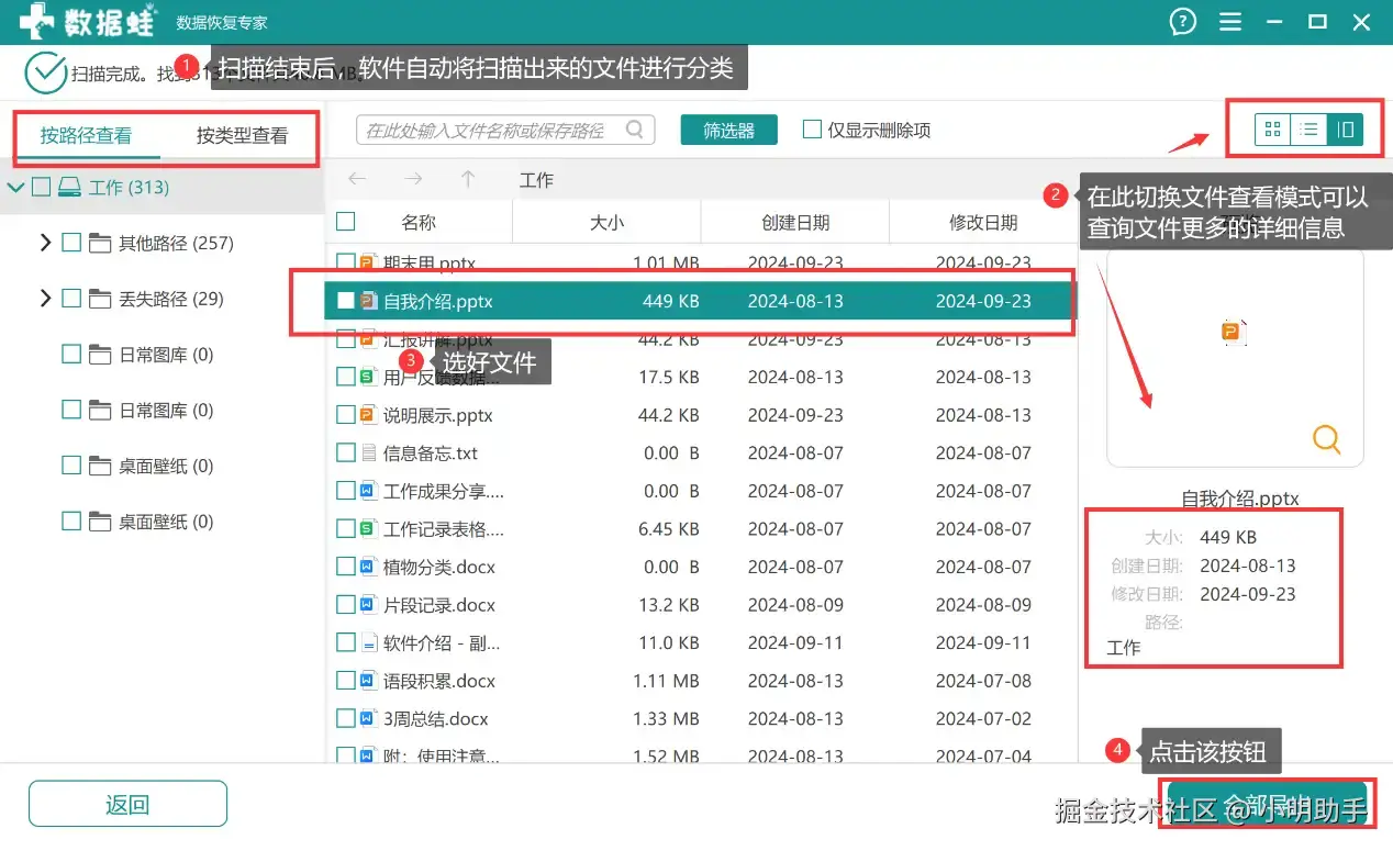 数据 蛙恢复专家这款软件不仅仅能够用于恢复pdf文件,还有多种类型的文件恢复也能派上用场。如果在发生文件丢失后越早地使用该软件,其恢复成功的概率能够大大增加。使用这款软件,还能够提前了解扫描文件的详细信息,帮助用户判断需要恢复哪个文件。