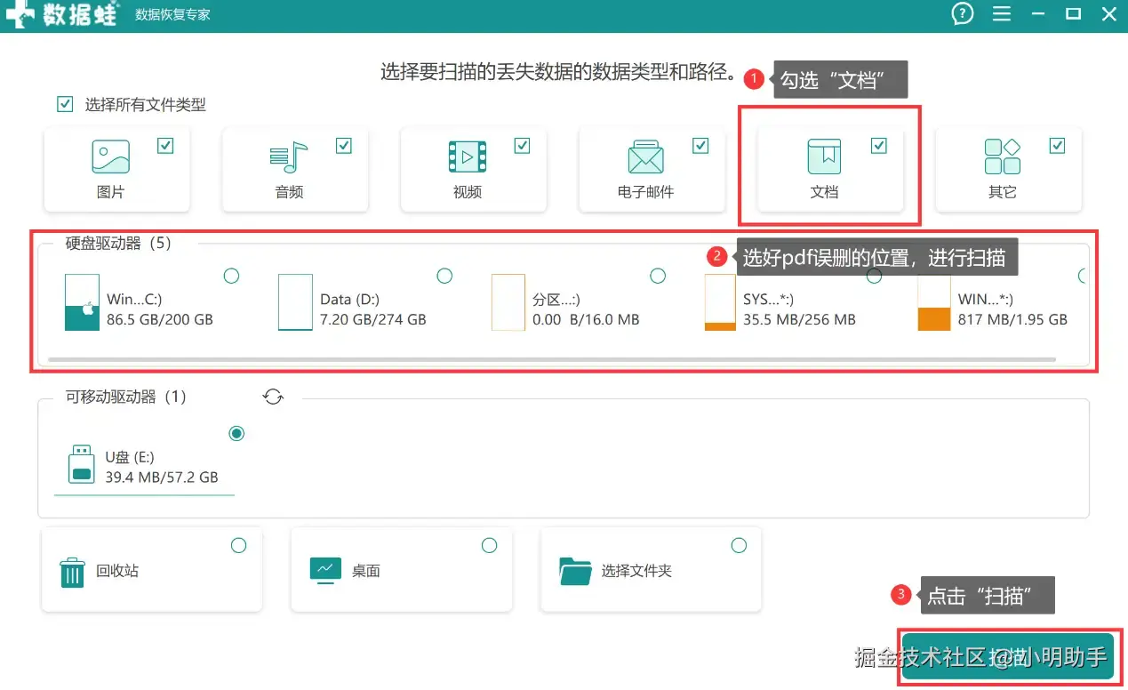 步骤1: 在软件的主页面里选择“文档”,在勾选好pdf文件丢失的位置,最后点“扫描”。