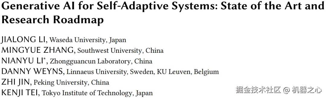 论文《Generative AI for Self-Adaptive Systems: State of the Art and Research Roadmap》的作者包括来自早稻田大学博士及研究助理 李家隆、西南大学讲师 张明悦、中关村国家实验室助理研究员 李念语(通讯作者)、鲁汶大学教授 Danny Weyns、北京大学教授 金芝以及东京工业大学长聘副教授 Kenji Tei。
