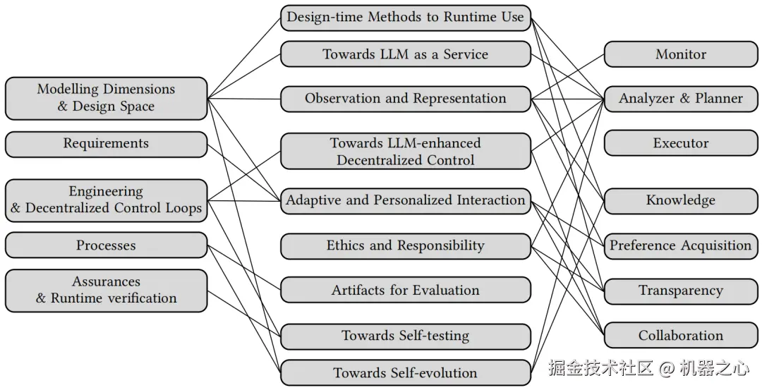 图:路线图展示了自适应系统中的软件工程关键点(左侧)与 LLMs 在自适应系统中的应用挑战(中间)之间的对应关系,以及这些挑战与自适应系统关键功能(右侧)的映射关系。