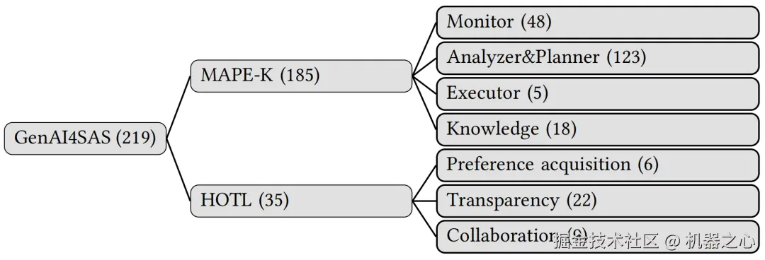 我们从 2017 年至 2024 年 6 月的顶级会议中筛选出 5874 篇文献,最终筛选出 219 篇与 GenAI 和自适应系统相关的研究。筛选后的文献从两种视角展开分析:第一个视角聚焦于 GenAI 在增强自适应系统功能和自主性方面的潜力,探讨其在监控、分析、规划、执行等核心模块中的应用及知识共享。第二个视角探讨了在 “人类监督自适应系统”(HOTL)中,GenAI 如何改善人与系统的互动。虽然自适应系统原本希望减少人为干预,但引入人类决策可以提高系统的可信度和效率。重点关注用户偏好获取、系统透明度和人机协作,以提升用户满意度、系统解释性和效率。