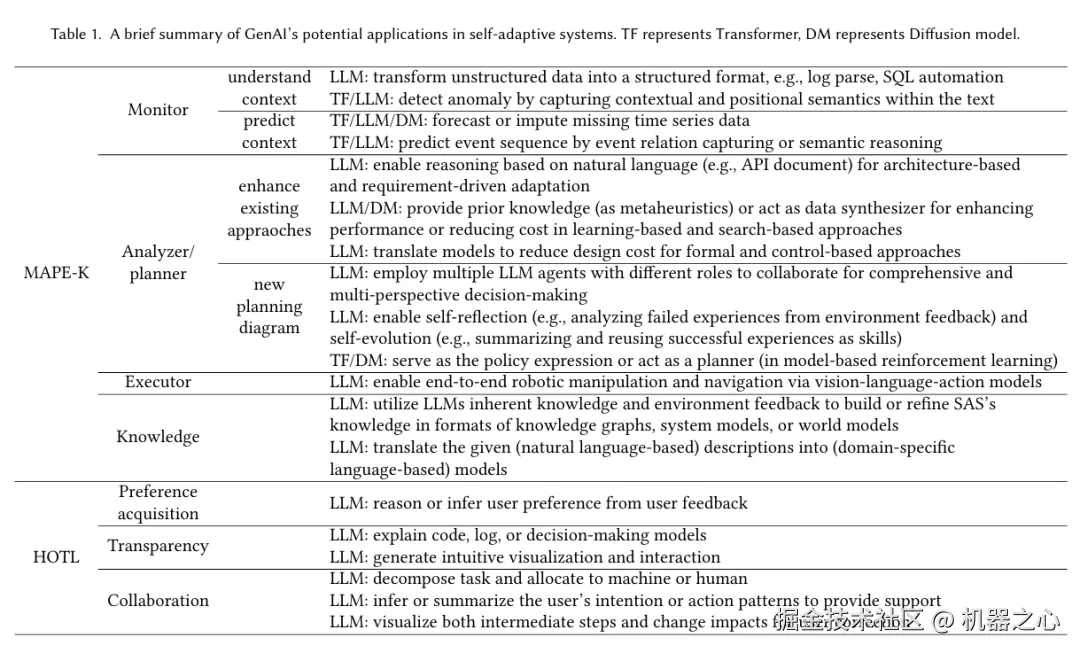 执行功能:虽然自适应系统的执行通常较简单,但 LLMs 在复杂情况下的执行转换中仍有潜力,尤其是在机器人领域中,LLMs 展现了在不确定环境下成功执行规划的能力。