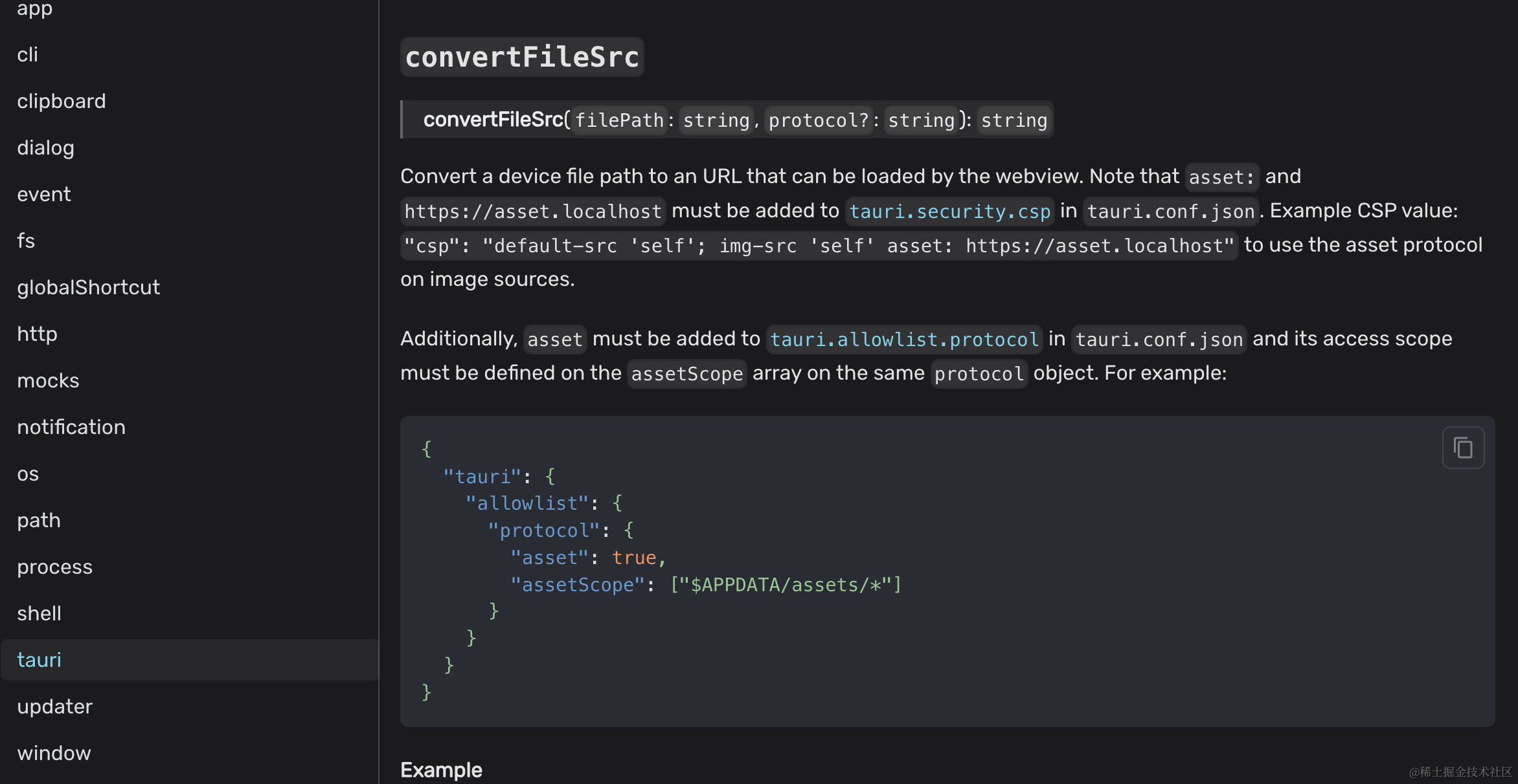 要想在前端页面中展示本地文件或者文件夹,需要使用convertfilesrc这个api,可以非常方便的展示内容,官方文档:tauri | Tauri Apps