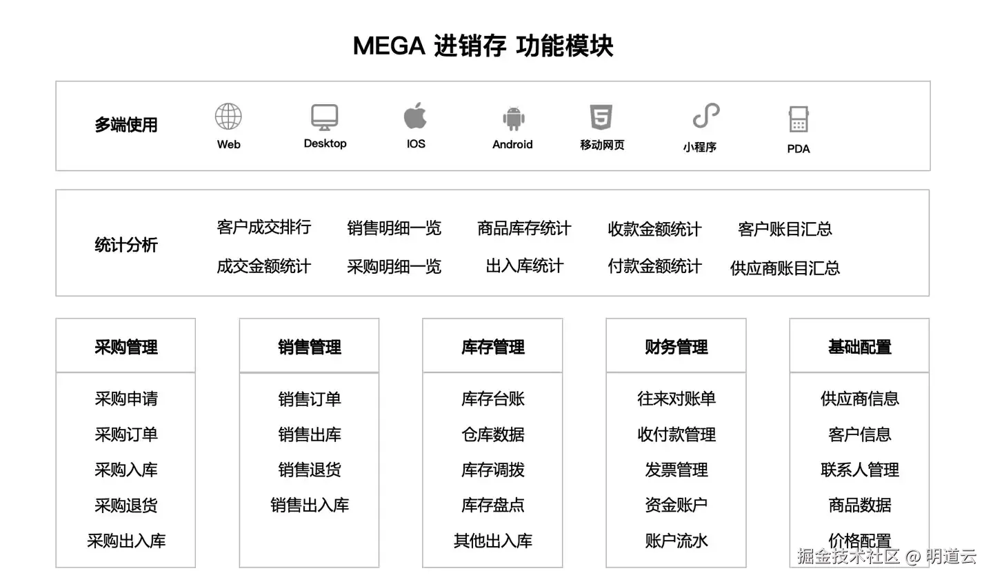 目前,MEGA系列包括面向L2C销售过程管理的MEGA CRM,以及面向客户交付项目管理的MEGA项目管理,还有面向销售、采购、仓储全流程的MEGA进销存。