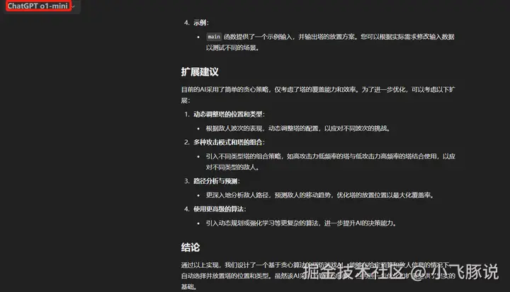 同时,我们让它做一个塔防游戏,o1-mini也能给出相应的意见。