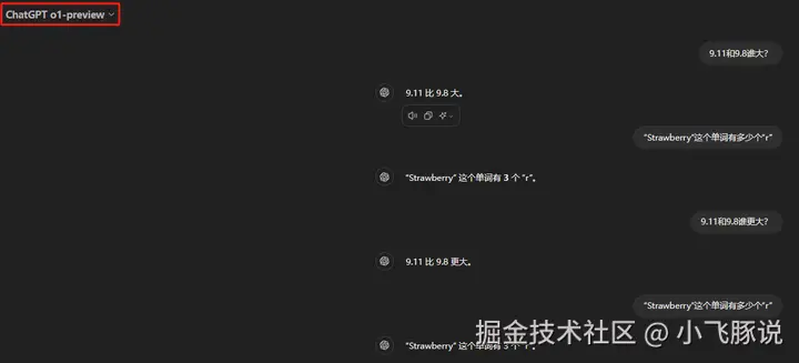 不过9.11和9.8依旧分不出谁更大,而且连续两次都回答错误。不过可以区分出“Strawberry“有多少个r了。