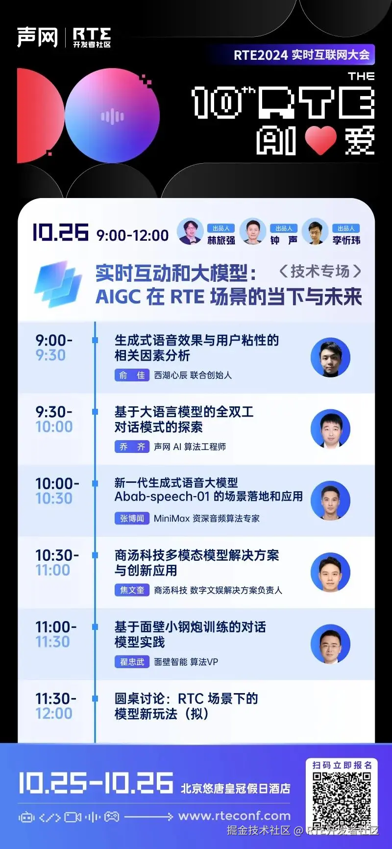 除了本场论坛,你还可以在 10 月 26 日一天逛遍 5 场技术论坛和约 30 场主题分享和圆桌讨论,一起来探索 GenAI、Voice AI、空间计算……与 RTE 的碰撞吧!