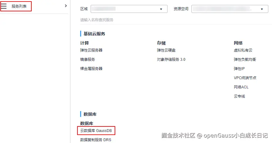 在左上角菜单服务列表找到云数据库GaussDB,单击进入实例列表页面。