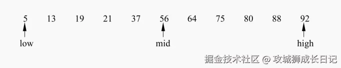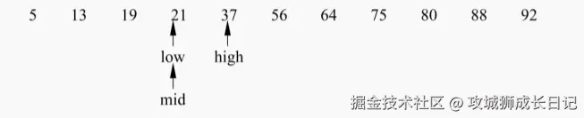 现在,让我们通过一个简单的图解方式,来理解怎么用“二分查找法”找数字。想象一下数组里这样排着数字:5, 13, 19, 21, 37, 56, 64, 75, 80, 88, 92,我们要找的数字m是21。按照二分查找的规则,一开始,low指针指向数组的第一个数字5,high指针指向最后一个数字92。然后,我们计算中间位置mid,它就是low和high指针位置相加后除以2,这里mid就会指向数字56。下面是一个简化的示意过程: