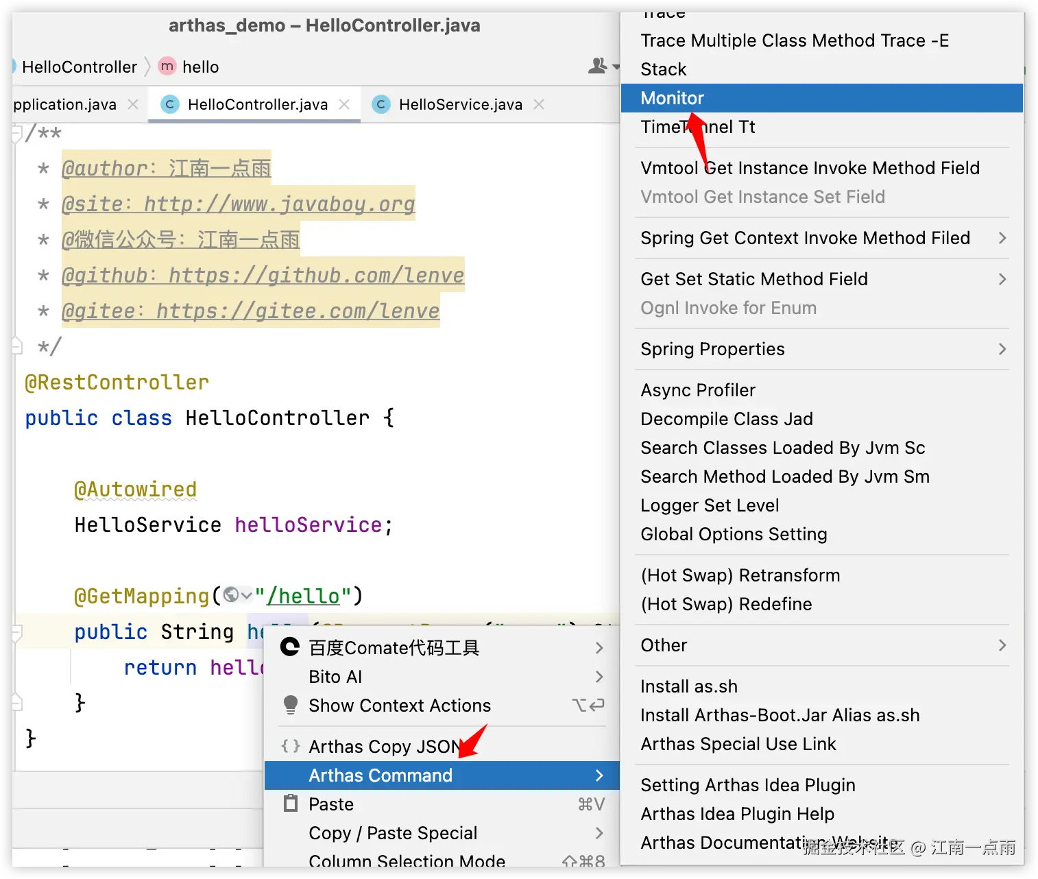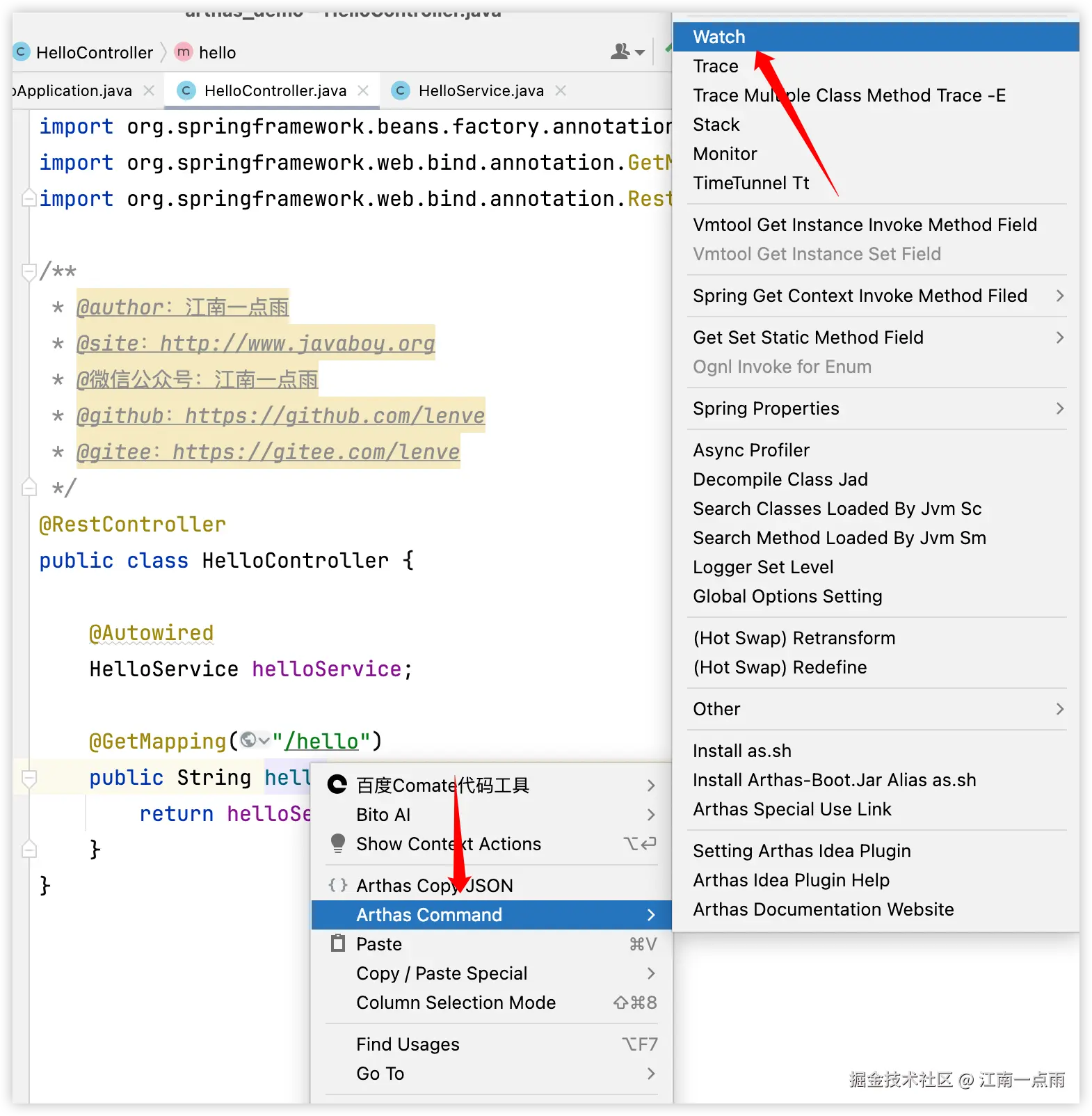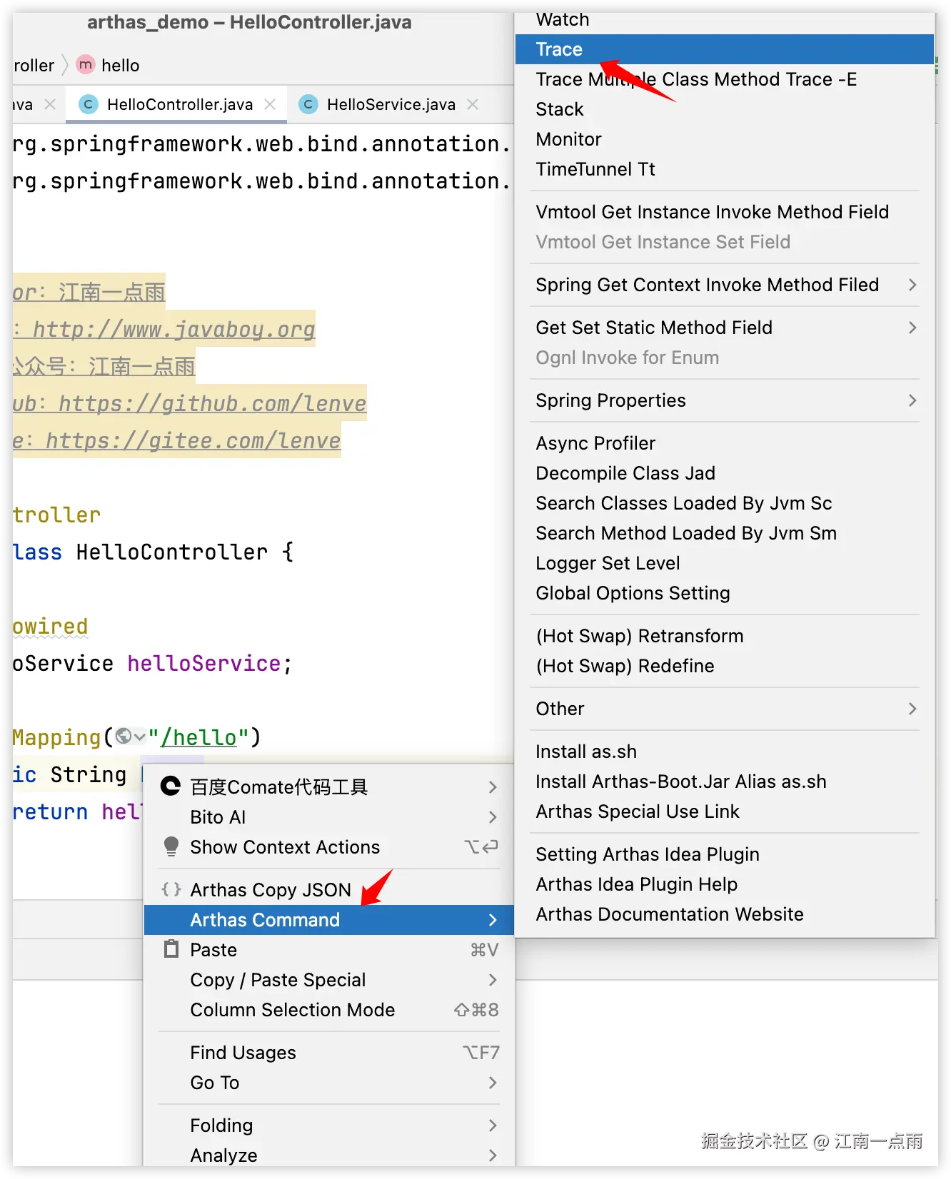 这个时候,我们想要查看 hello 接口为什么慢,鼠标放在接口方法名上,然后选择 Arthas Command -> Trace,就可以生成指令: