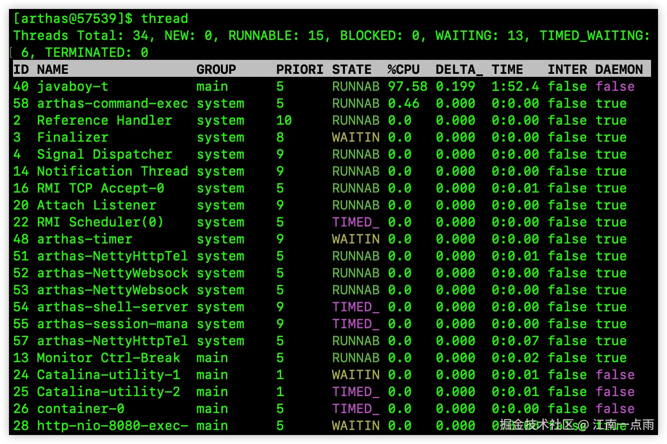 进入到 Arthas 控制台之后,先输入 thread 可以查看我们项目中各个线程的运行情况: