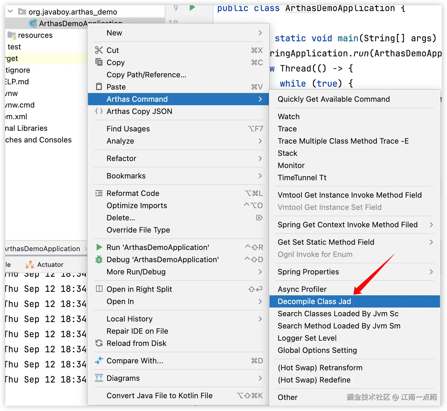 我们在 IDEA 中找到出问题的类,选择 Arthas Command->Decompile Class Jad。
