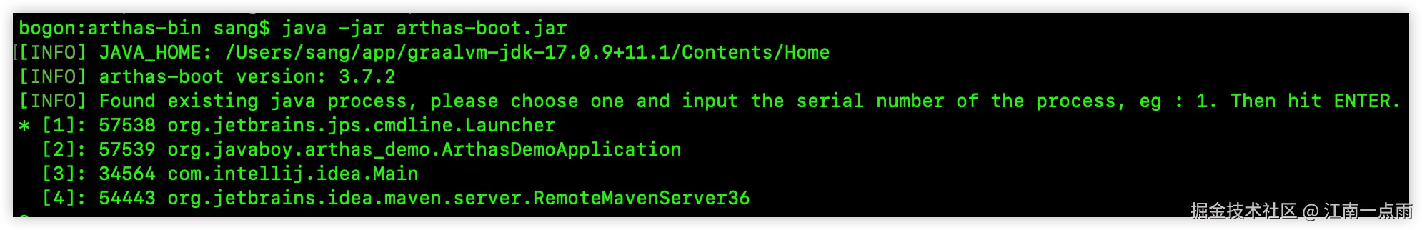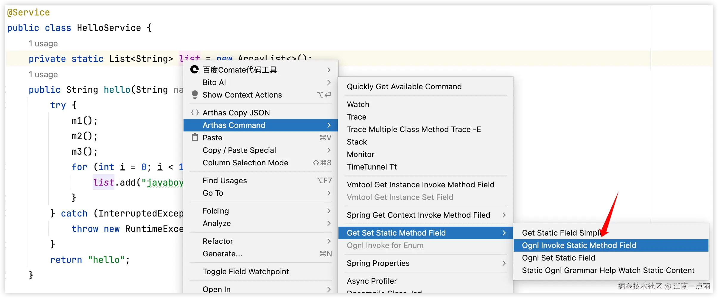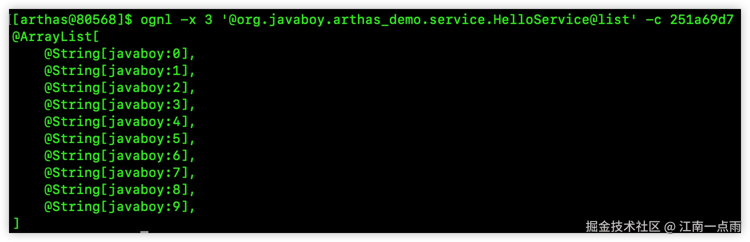 生成的命令是这样 ognl -x 3 '@org.javaboy.arthas_demo.service.HelloService@list' -c 251a69d7。