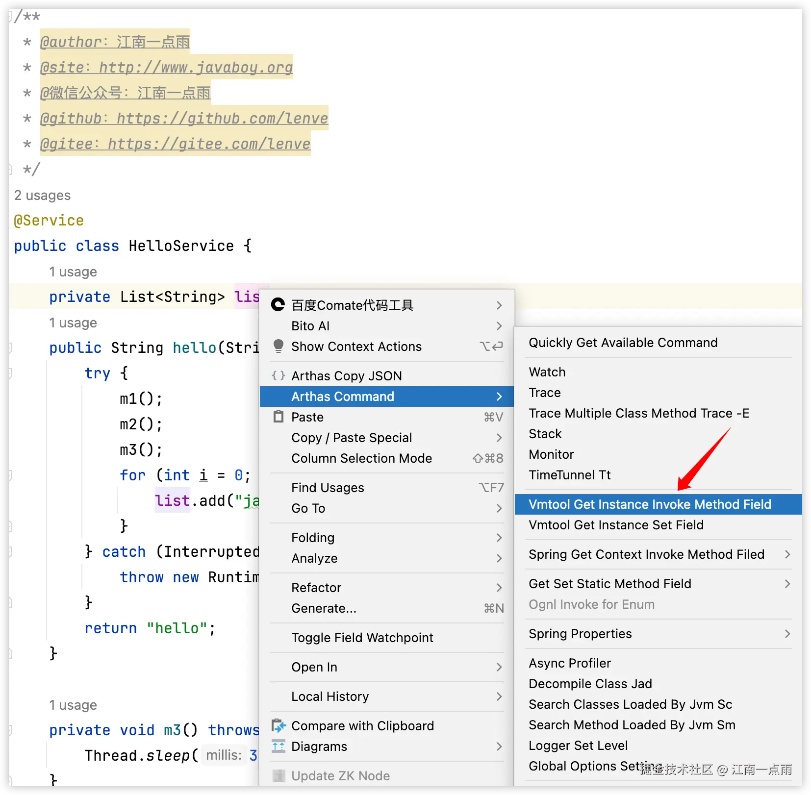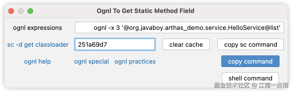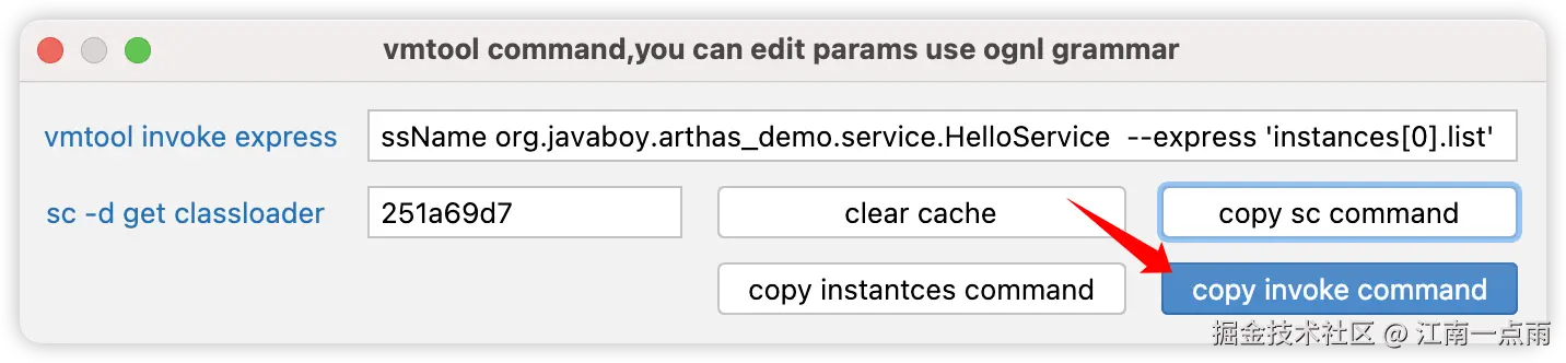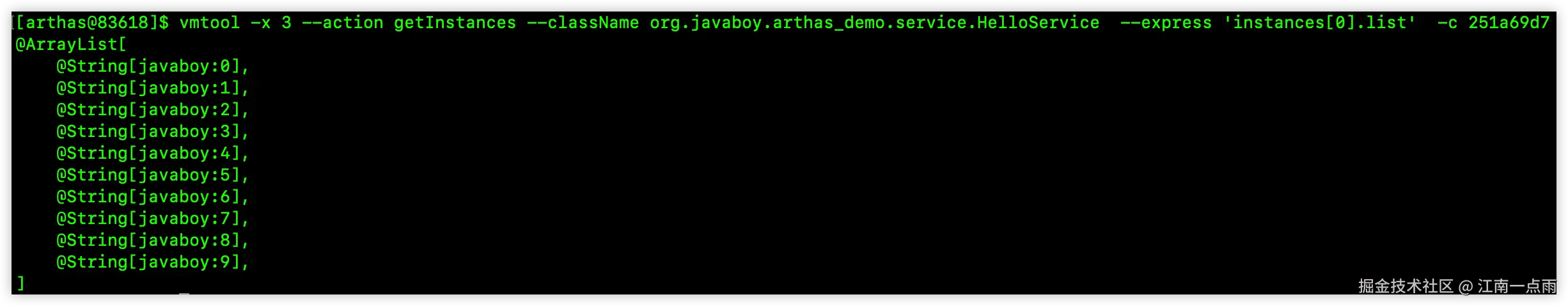 生成的指令是这样 vmtool -x 3 --action getInstances --className org.javaboy.arthas_demo.service.HelloService --express 'instances[0].list' -c 251a69d7。