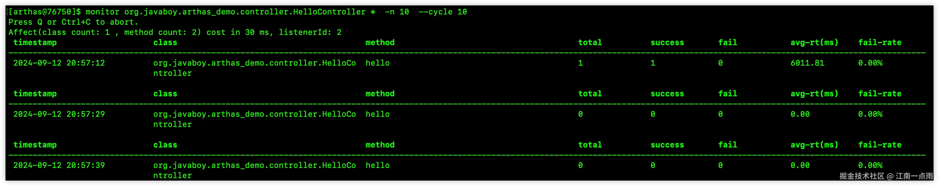 生成的指令是这样:monitor org.javaboy.arthas_demo.controller.HelloController * -n 10 --cycle 10 。cycle 参数表示统计周期,这里是 10s 一次。