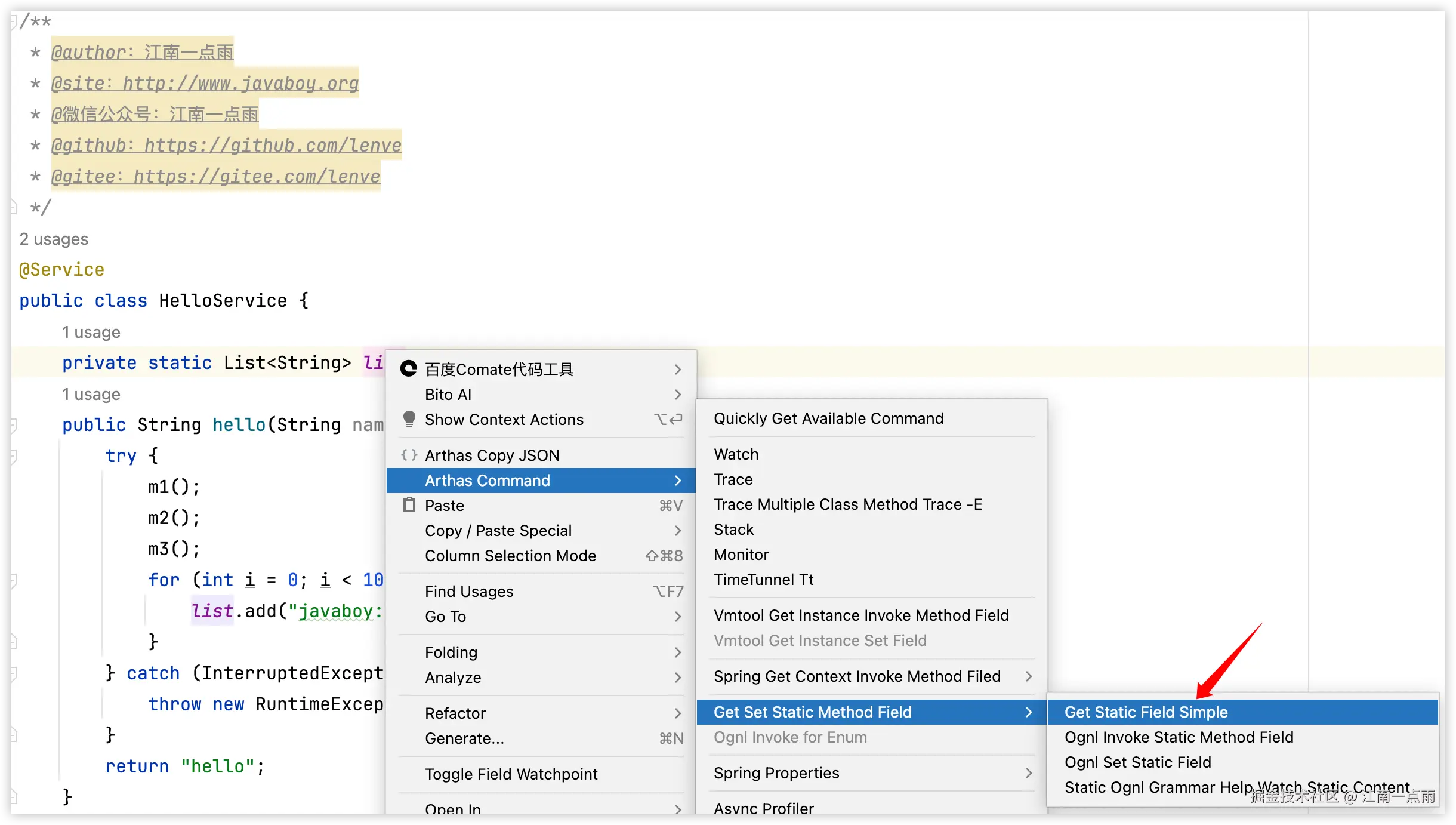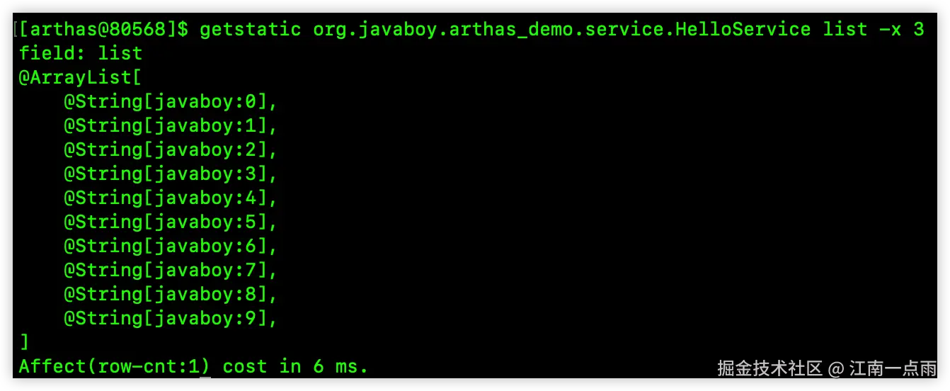 生成的指令是这样 getstatic org.javaboy.arthas_demo.service.HelloService list -x 3。