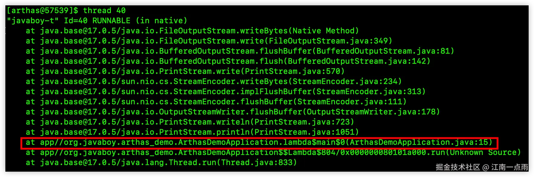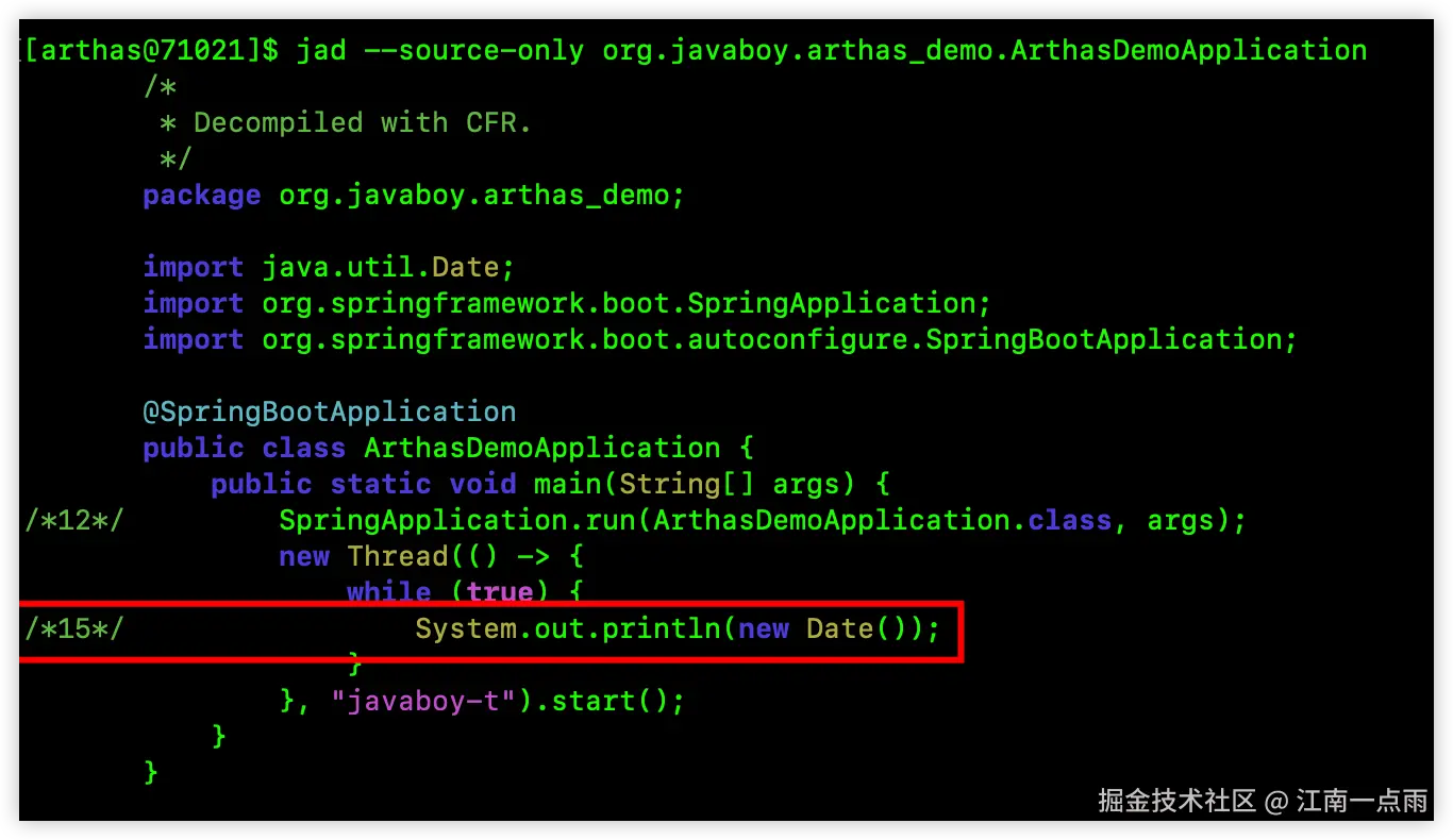 此时会自动生成指令 jad --source-only org.javaboy.arthas_demo.ArthasDemoApplication,将之拷贝到 Arthas 控制台去执行。
