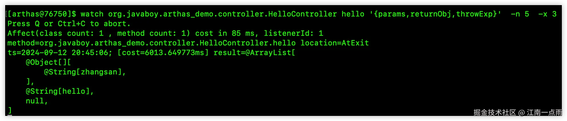 生成的指令是这样:watch org.javaboy.arthas_demo.controller.HelloController hello '{params,returnObj,throwExp}' -n 5 -x 3。