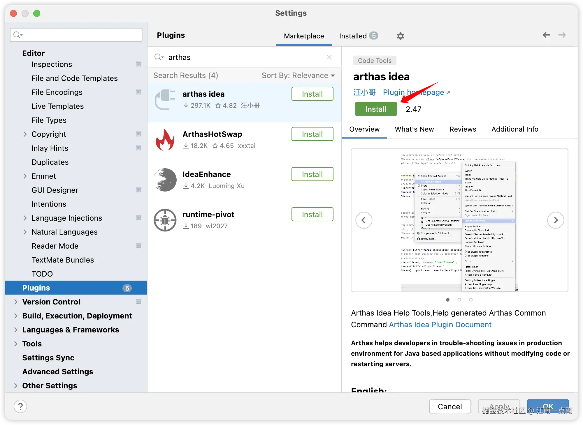 直接在 IDEA 的插件市场搜索 Arthas,第一个就是: