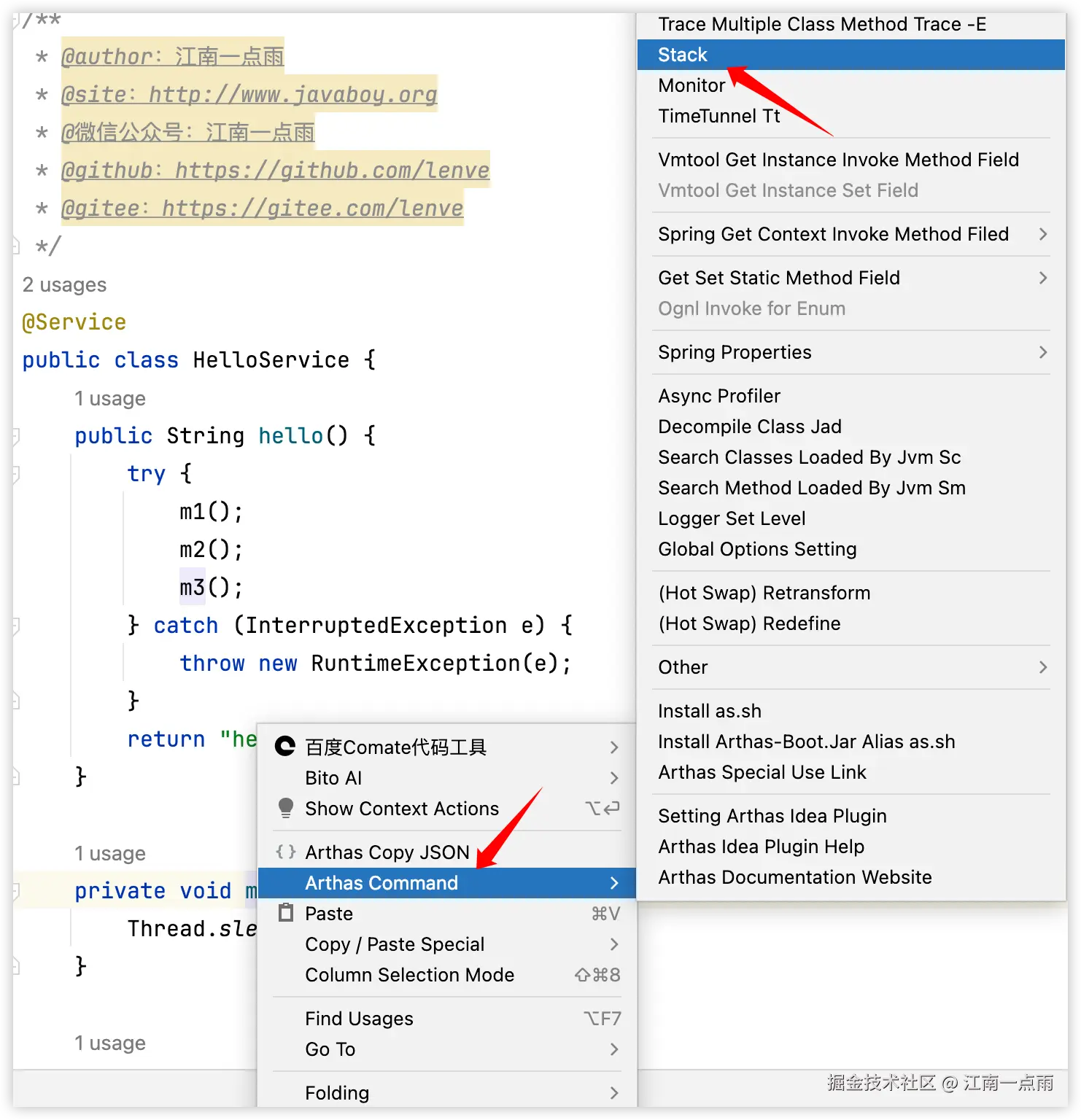 比如我们想查看 m3 方法执行的堆栈信息,那么点击 Arthas Commands -> Stack,就可以生成相关指令: