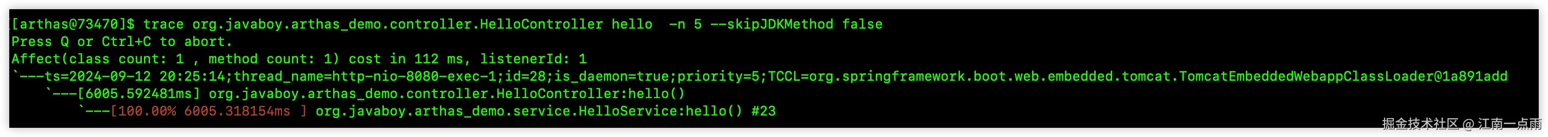 生成的指令如下 trace org.javaboy.arthas_demo.controller.HelloController hello -n 5 --skipJDKMethod false。