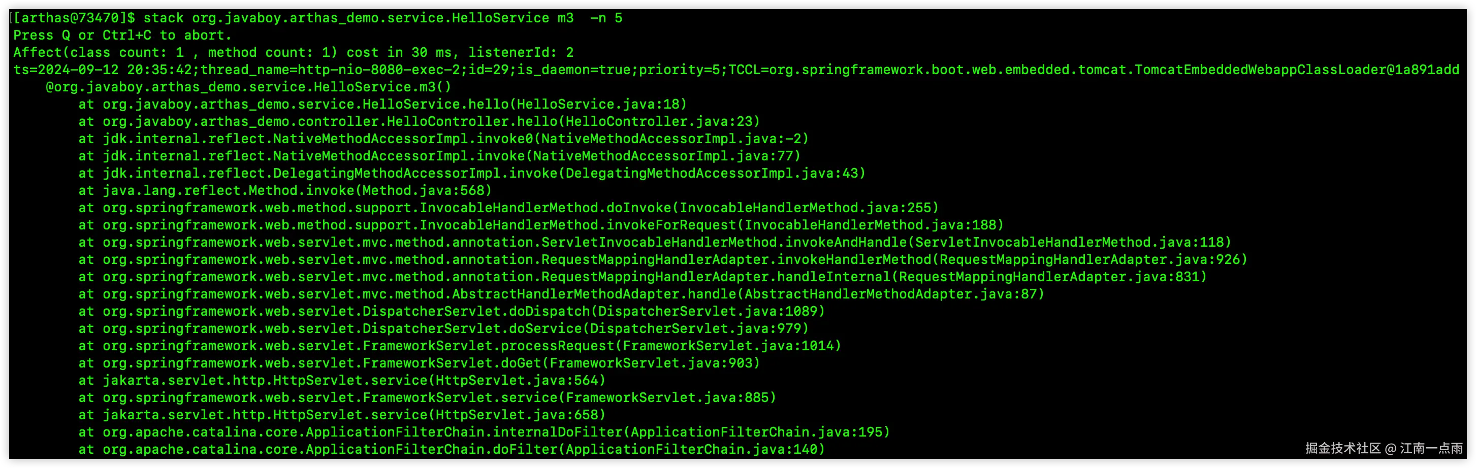 生成的指令是这样 stack org.javaboy.arthas_demo.service.HelloService m3 -n 5 。