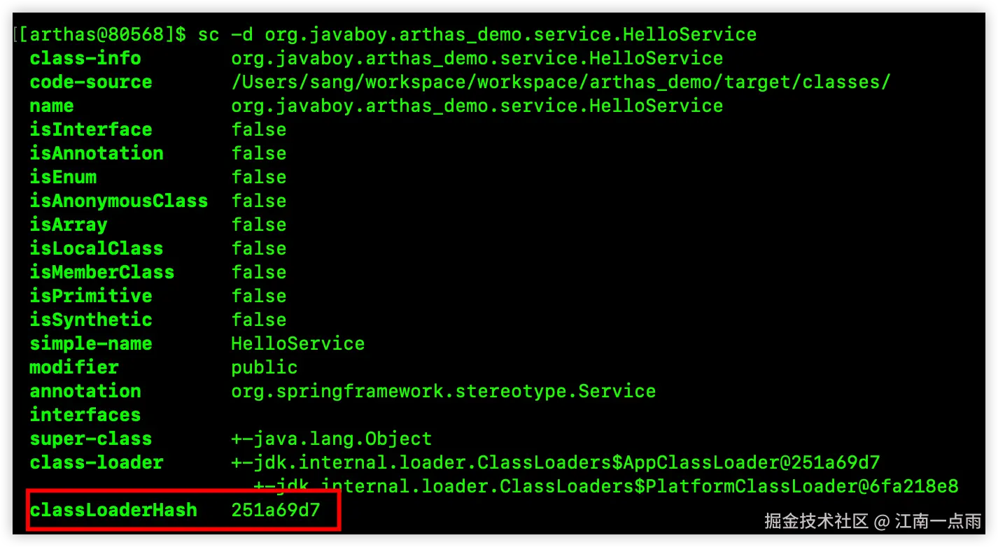 对应的命令是这样的 sc -d org.javaboy.arthas_demo.service.HelloService。
