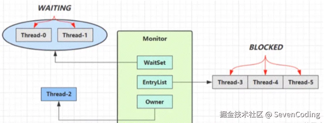 - 图中WaitSet中的Thread-0,Thread-1是之前获得过锁,但条件不满足而进入waiting状态的线程