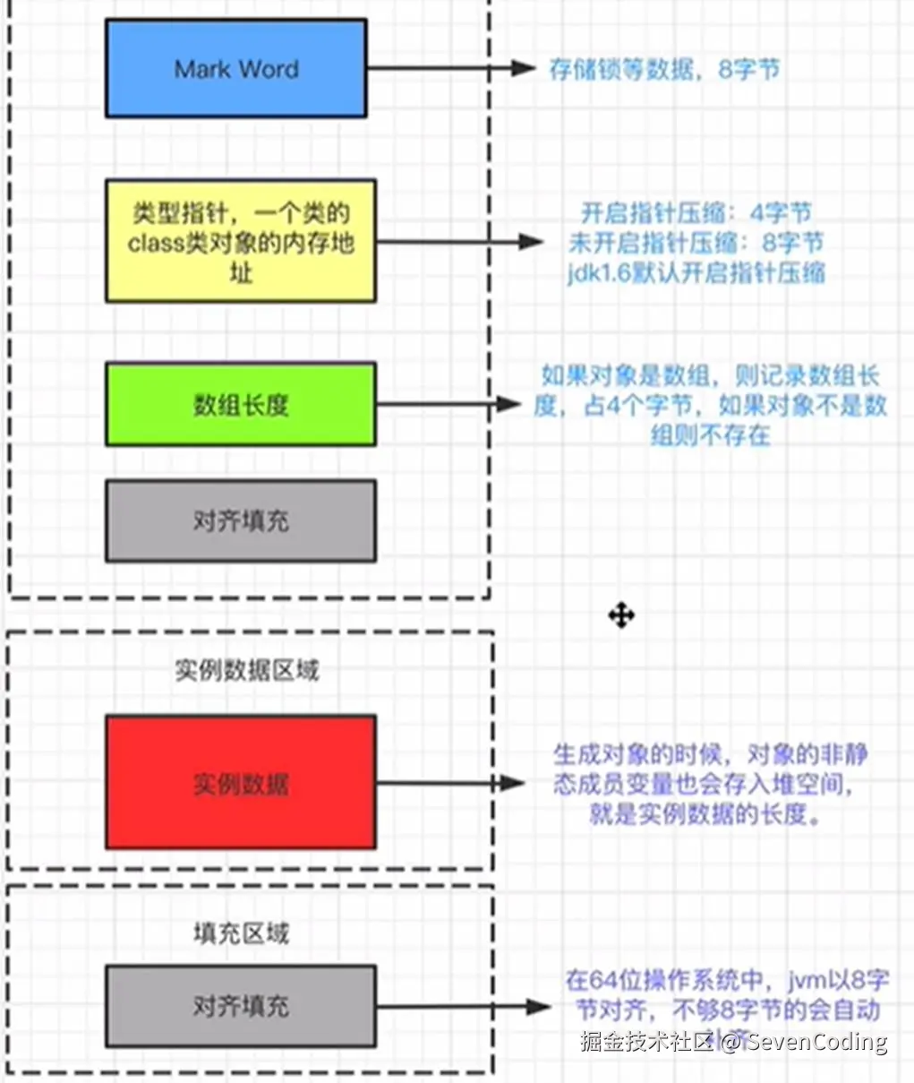 HotSpot虚拟机中,对象在内存中存储的布局可以分为三块区域:对象头(Header)、实例数据(Instance Data)和对齐填充(Padding)。