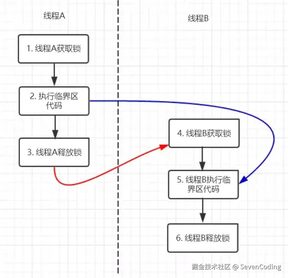 在图中每一个箭头连接的两个节点就代表之间的happens-before关系,黑色的是通过程序顺序规则推导出来,红色的为监视器锁规则推导而出:线程A释放锁happens-before线程B加锁,蓝色的则是通过程序顺序规则和监视器锁规则推测出来happens-befor关系,通过传递性规则进一步推导的happens-before关系。