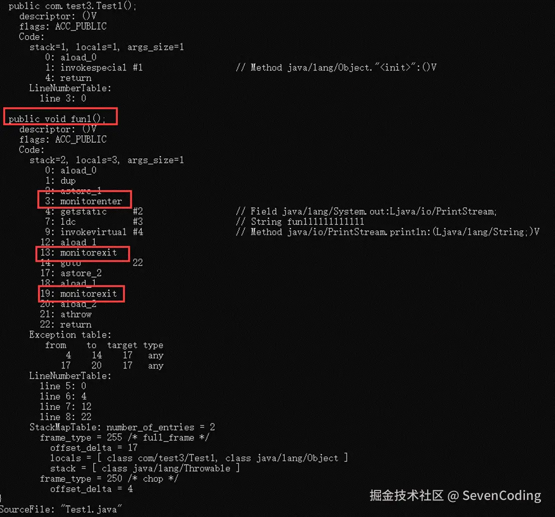 将.java文件使用javac命令编译为.class文件,然后将class文件反编译出来。反编译的字节码文件截取: