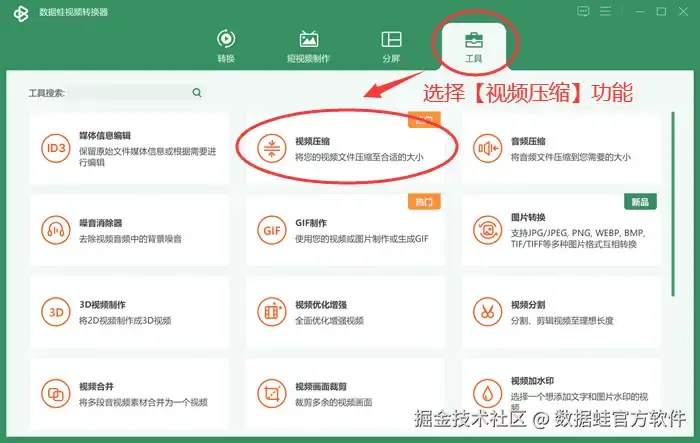 第一步: 启动程序后,进入 【工具】 选项卡,选择 【视频压缩】 功能,接着点击 【+】 框框,上传您想要压缩的mp4视频文件。