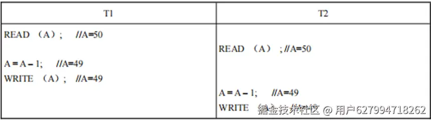 是 50,T2 将此值修改为 49 后写回数据库并覆盖了 T1 事务对 A 的修改,此时,A 的值为49,就会出现这种情况:卖出两张车票后车票总数应为 48,而数据库中车票的总数为 49,