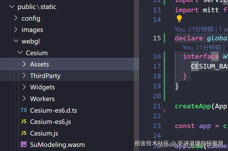 把 node_modules/cesium/Build/CesiumUnminified/ 这个未压缩版本的文件夹下内容, Assets、Widgets、Workers、ThirdParty 四个文件夹拷贝到 public/static/Cesium/ 下