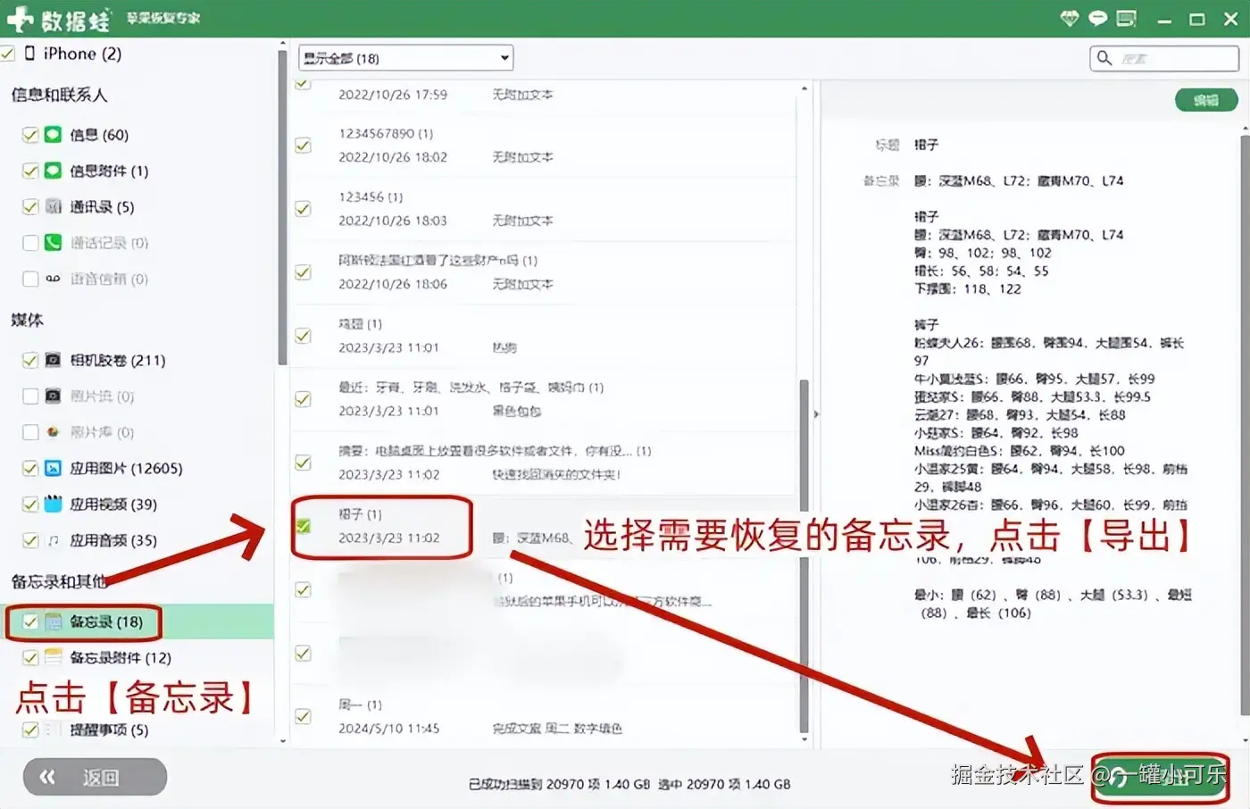 步骤2:扫描完成后,找到 【备忘录】 ,预览并选择你想要恢复的备忘录,确认选择的备忘录数据之后,点击 【导出】。