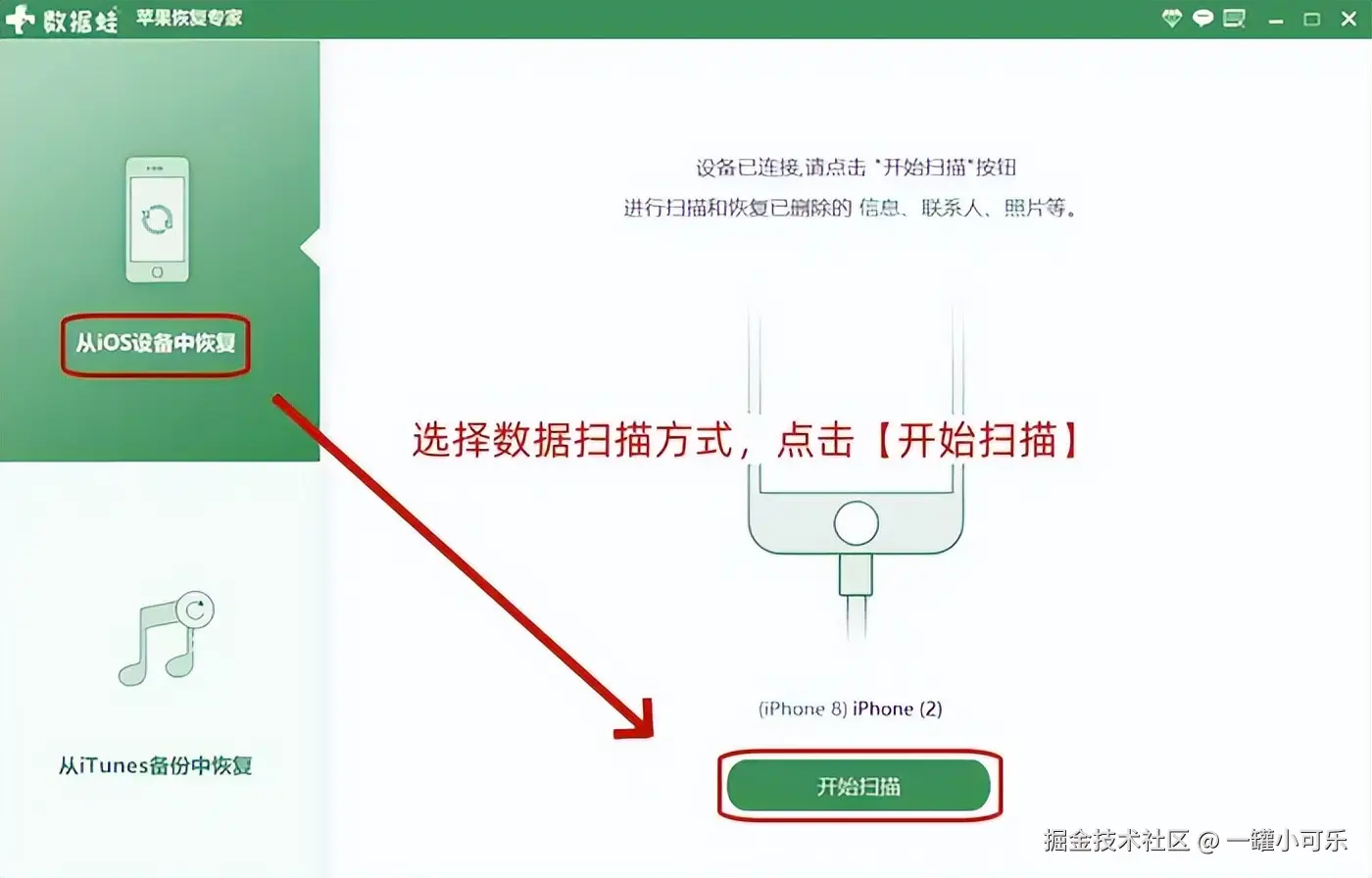 步骤1:使用USB线将你的iPhone连接到电脑,并运行软件。选择 【从iOS设备恢复】 模式。点击 【开始扫描】 ,软件将开始扫描你的iPhone。