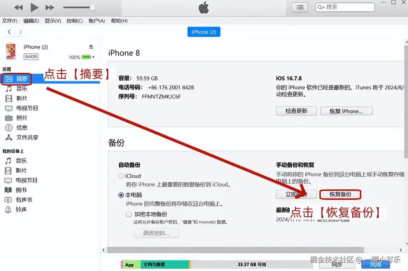 步骤2:在 【摘要】 页面,点击 【恢复备份】 ,等待恢复过程完成,你的备忘录将会被恢复到iPhone上。